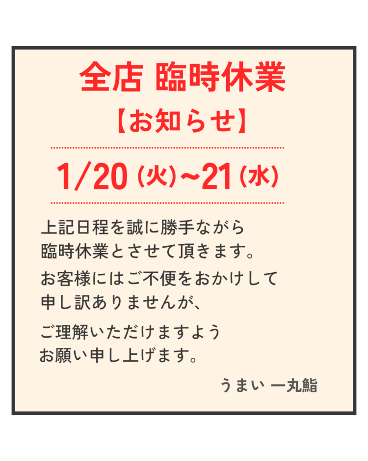 【全店】1月20(火)・21日(水) 臨時休業のお知らせ