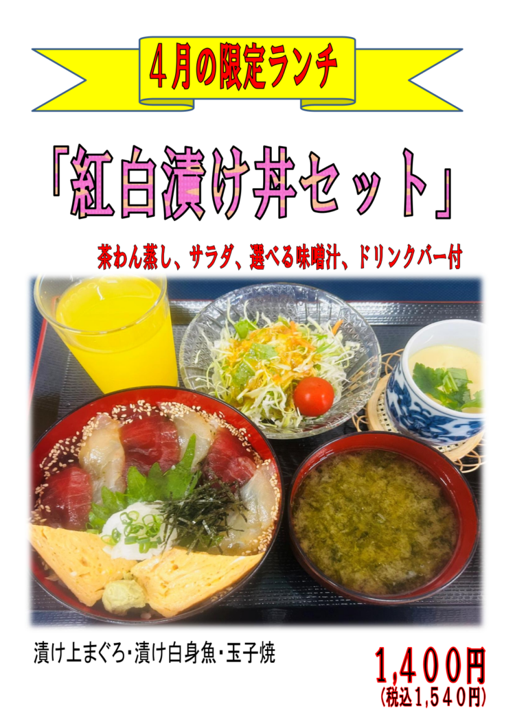 4月限定ランチは、漬け上まぐろと漬け白身魚を贅沢に盛り付けた
